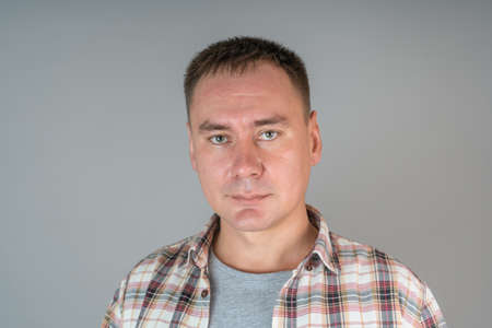Portrait of a confident man in a shirt aged 30 years, on a gray background