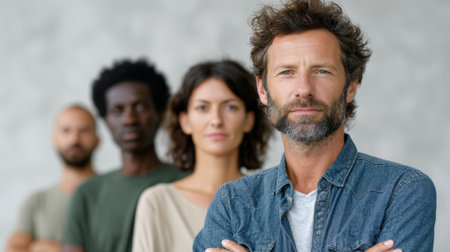 Diverse group of people in different ages and ethnicities stand together and looking forward. Diversity and multi ethnicity concept