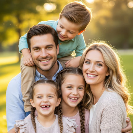 A heartwarming family portrait captures a joyful moment with two children and their parents, all beaming with happiness. The image radiates love and togetherness, showcasing the close bond shared among family members in a cozy, sunlit setting.