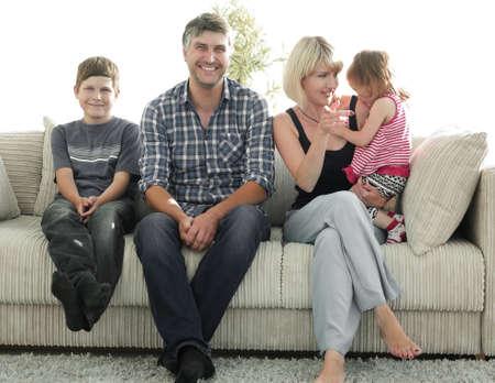 concept of happy childhood, family, love - group of people on a white background: adults and children with toys sitting on the same couch