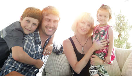 Happy family sitting on couch at home. Grandparents, grandparents and grandchildren are looking at camera and smiling.
