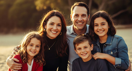 A joyful family portrait in a sunlit outdoor setting, featuring five members smiling and enjoying each others company