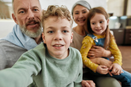 Excited little boy making a selfie with family at home, cheerful grandparent spending time with grandchildren, playing and having fun in the living room