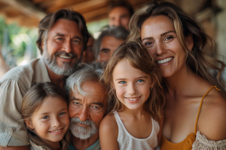 A close-up captures a multigenerational family, all smiling warmly. The image showcases various skin tones and ages, with a balanced composition. Soft lighting enhances the positive mood. Suitable for use in marketing materials and general illustrations emphasizing relationships and unity, both in commercial and editorial contexts.