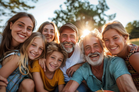 Faces of a multigenerational family lit up by summer sunshine at a joyful outdoor picnic