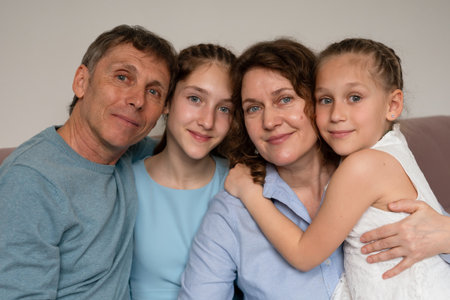 A joyful family of four standing close together and smiling against a plain background, radiating warmth and togetherness. The image captures a moment of unity and happiness, perfect for family-oriented themes.