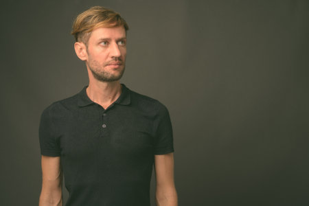 Studio shot of blond bearded man against gray background