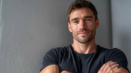 A confident young man with a relaxed expression poses against a neutral background, showcasing strength and charm. Perfect for lifestyle and fitness themes.