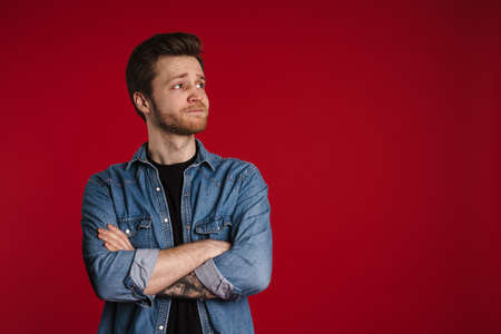 Happy young white man in casual clothes standing isolated over red, looking aside