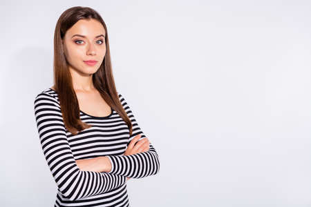 Turned portrait of concentrated lady looking crossing her hands wearing striped shirt isolated over white background
