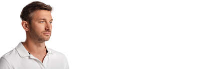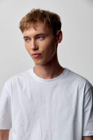 Man in white tee looking away, casual studio shot with soft lighting and clean grey backdrop, minimal style for fashion or lifestyle catalog, showcasing natural pose and relaxed mood for ecommerce use