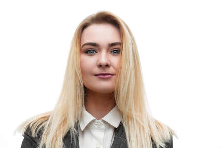 Confident businesswoman, people emotion, youth and beauty. Young calm concentrated thoughtful serious caucasian woman looking at camera face expression portrait on studio grey background