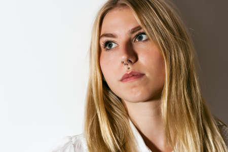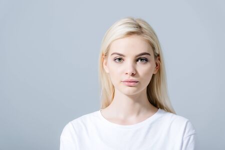 Beautiful young serious clever blonde woman without makeup on white wall. Pretty female with curly hair in white t shirt