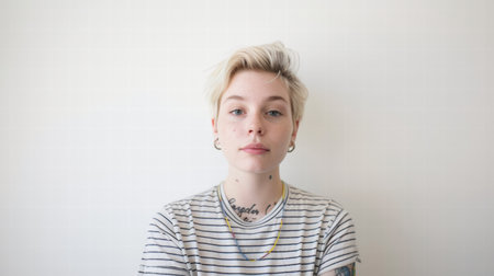 A young woman with short blonde hair and striped shirt looking confidently at camera