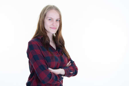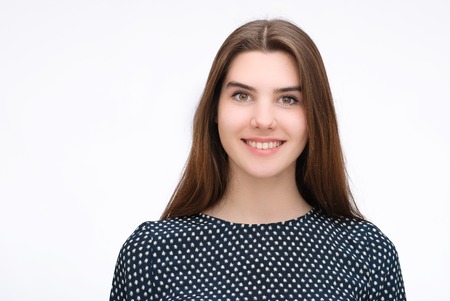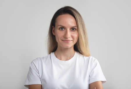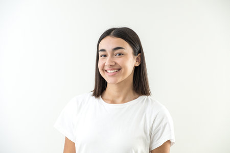 Happy and smiling young girl looking at camera in studio. Calm and confident with white t-shirt on white background.