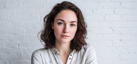 A young woman stands in a well-lit room with a light brick wall in the background. She has curly hair and a relaxed expression. Her outfit is simple and casual.