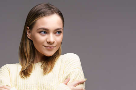 A portrait of a Caucasian woman in a yellow sweater looks to the side on a gray background. Young cute woman looking to the side.