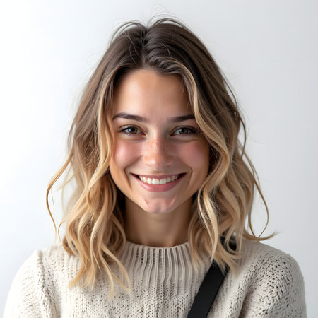A woman stands confidently, showcasing her wavy hair and bright blue eyes. She wears a light top, exuding a natural charm in a softly lit room. Her expression captivates attention effortlessly.