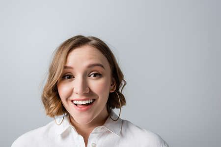 Closeup portrait of happy creative young woman carefree and looking directly to the camera over grey wall. Female at her 40s relaxed in white t-shirt