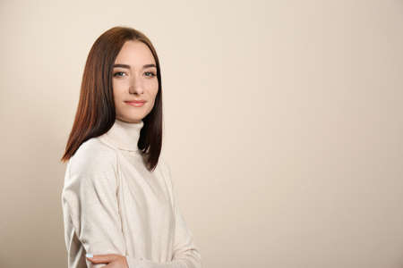 Portrait of pretty young woman with gorgeous chestnut hair on light background, space for text