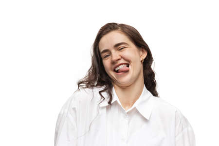 Flirting. Young caucasian woman with funny, unusual popular emotions and gestures on white studio background. Human emotions, facial expression, sales, ad concept. Trendy look inspired by memes.