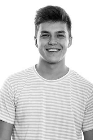 Portrait of happy cheerful teenager boy wearing blue-white striped button shirt looking at camera. Studio shot on gray background