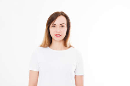 close-up portrait young pretty woman smiling in white t-shirt on white background, happy, positive mood, isolated, sincere smile. copy space