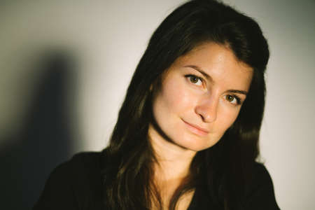 light smile on beautiful young european or american woman looking straight at camera in casual clothes, close up