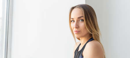 Bright beauty portrait by the window of blond woman with copy space. Single woman and millennial concept.