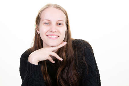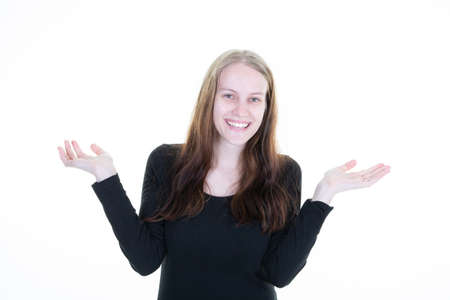 Portrait of a happy cute woman in a black dress on a white background smiling.