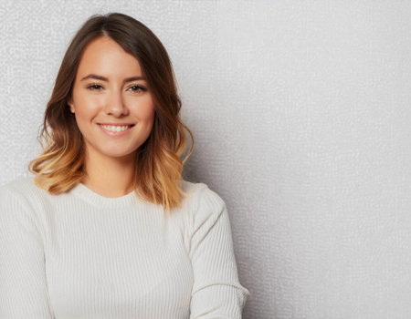 Woman smiling and looking aside, dressed in casual shirt, poses on white wall.