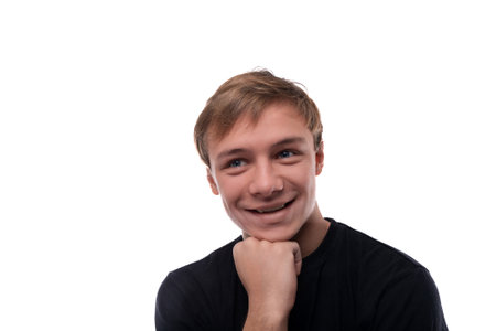 Positive Caucasian fair-haired teenager guy smiling at the camera on a studio background