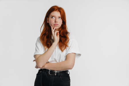 Ginger beautiful serious girl thinking and looking upward isolated over white background