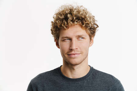 Young blonde man with curly hair smiling and looking aside isolated over white wall