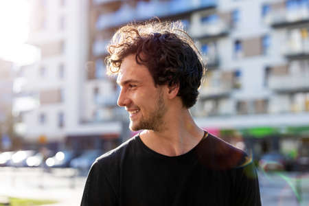 Lifestyle portrait of a young Caucasian man in casual wear on a blurred background of the urban environment.
