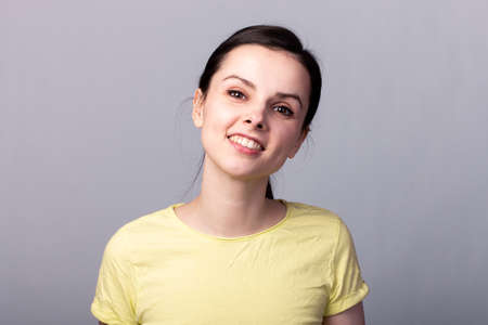 Beautiful happy dark skinned african american ethnicity woman in yellow tshirt while looking in camera with pleasant smile, posing against gray green studio wall background