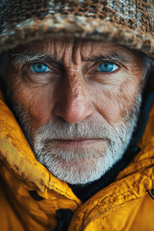 A closeup portrait of an elderly sailor with piercing blue eyes and a weathered face, wearing a woolen hat and yellow jacket