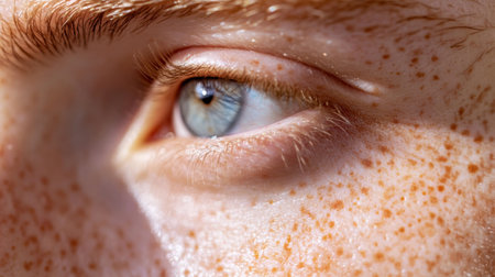 A captivating close-up profile of a man showcasing light blue eyes and intricate skin textures, highlighting emotion and personality in soft natural light.