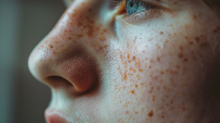 A person looks towards the side with visible skin details, soft light highlighting features, creating an authentic emotion and simple background.