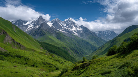 This stunning mountain landscape showcases lush green valleys, majestic snow-capped peaks, and a vibrant blue sky. Ideal for nature lovers.