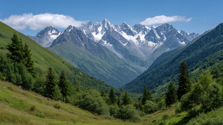 Breathtaking Mountain Landscape Featuring Snow-Capped Peaks and Lush Greenery