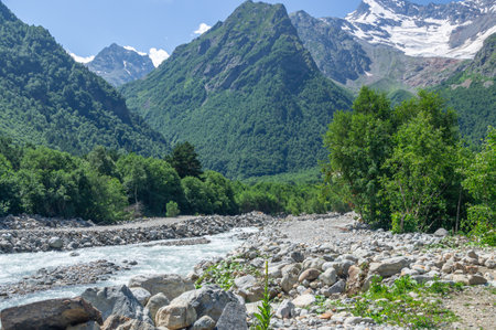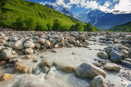 rough mountain stream and snow-capped peaks of the Caucasus Mountains in Upper Svaneti, Greater Caucasus Mountain Range in Georgia