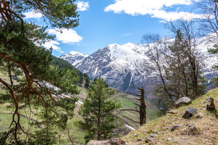 mountain landscape, view of the Caucasus Mountains with snow-capped peaks.