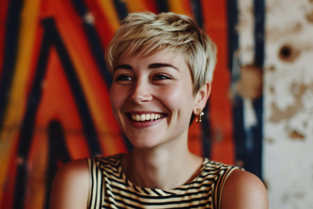 Blonde-Haired Woman Brimming With Joy, Laughing In Vibrant Surroundings, Ample Copy Space. Concept Energetic Fitness Routine, Serene Nature Scenes, Quirky Street Art, Candid Moments.