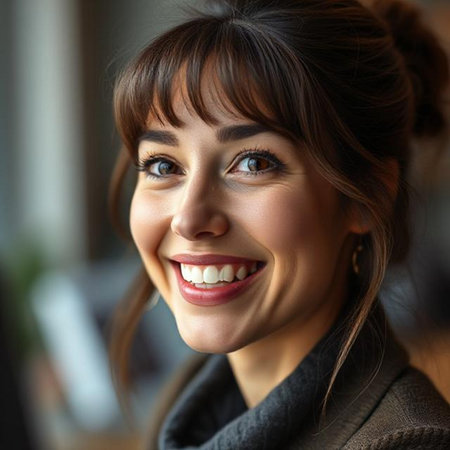 A tight close-up shot captures the joyful, laughing face of a person looking up and to the side. They have a wide, happy smile, and the soft indoor lighting focuses on their genuine expression of happiness and amusement.
