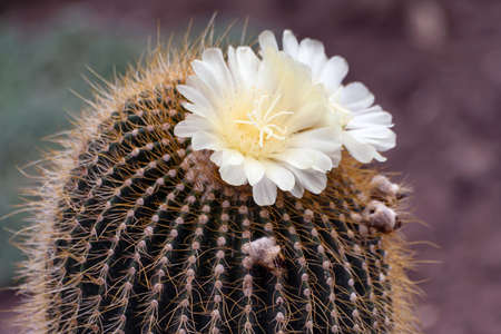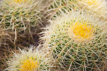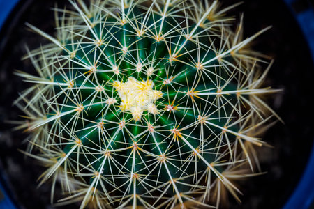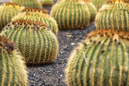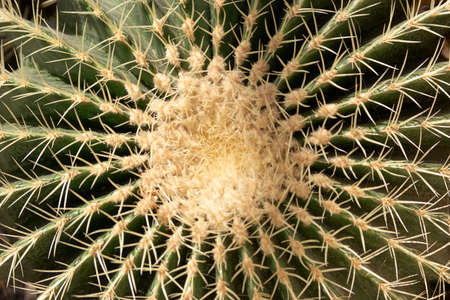 Close up of golden barrel of Echinocactus grusonii. Exotic prickly plant close up. Top view.