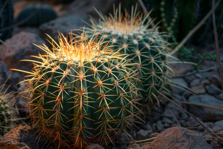 The mesmerizing beauty of a glowing cactus at sunset in the arid desert landscape, illuminated by the warm, golden hour light, showcasing the intricate details of its spines and succulent texture