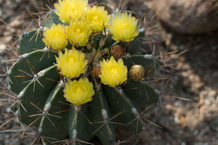 Cactuses with yellow flowers in the botanical garden. Selective focus.