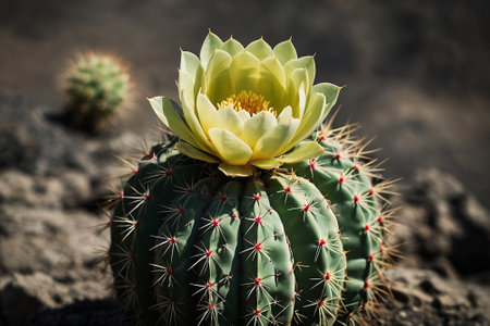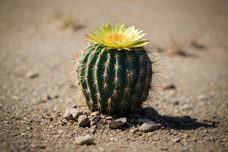 Cactus with yellow flower in the middle of dry desert soil.