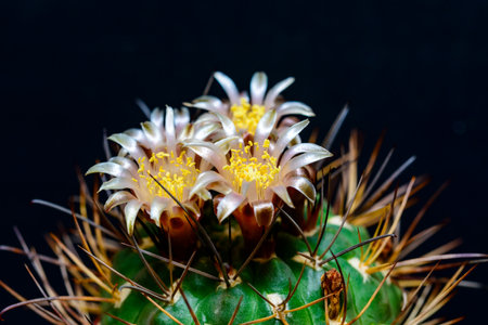 Blooming of cactus flower. Named Hamatocactus setispinus
